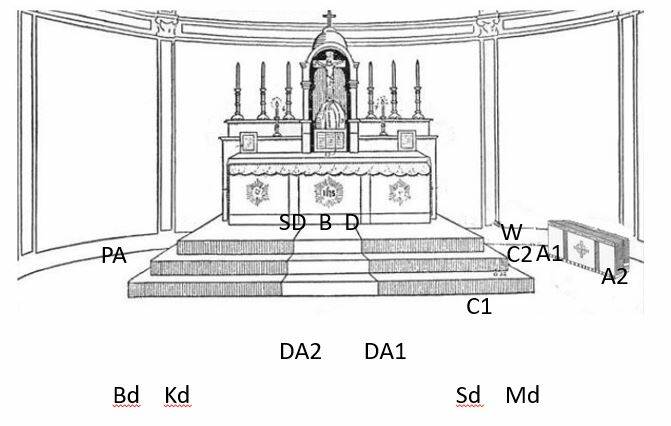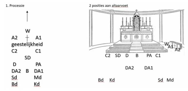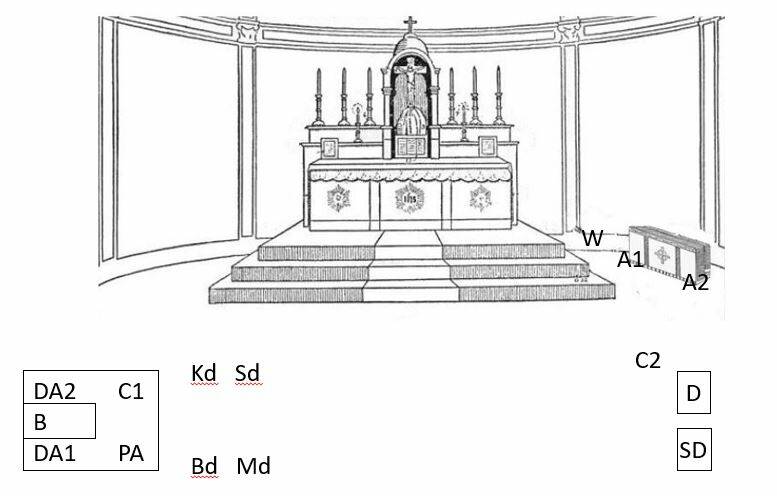 Zo zie je het ook op het filmfragment, maar vaak staat het dunne missaal voor aanvang al voor het tabernakel en gaan Bd (met het dikke missaal in de handen) en Kd bij binnenkomst onmiddellijk naar hun plaats zoals hierboven rechts op het schema.