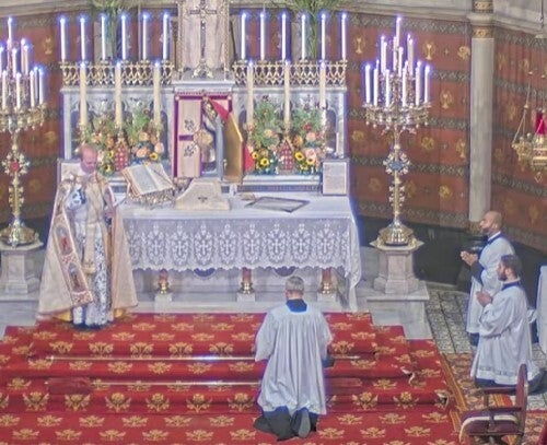 De priester gaat met de ceremoniaris naar de altaarvoet, maken een kniebuiging en knielen dan op beide knieën. P vangt het Veni Creator aan. Zoals gebruikelijk staat men recht na de eerste strofe, dus ook de derde ordelingen en hun peters/meters.