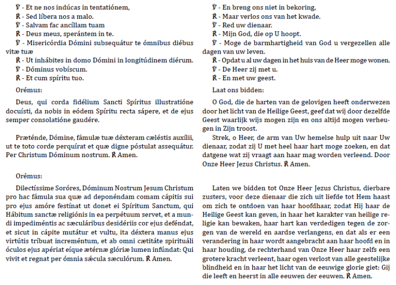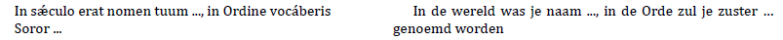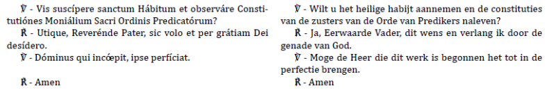 De postulante staat recht en de priester kan gaan zitten, alsook D en SD. Dan volgt een maning in het latijn van enkele minuten (die hieronder niet opgenomen is) waarin hij de verplichtingen uitlegt voor de drie religieuze geloften en de boetedoeningen van de Orde. Hij stelt daarna volgende vragen :