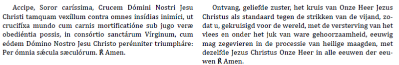 C reikt het kruis en de rozenkrans aan. P overhandigt het kruis en de rozenkrans aan de nieuwe novice die geknield zit, en bidt :