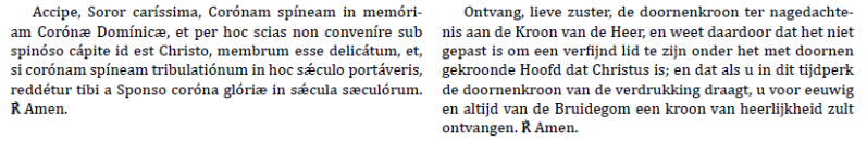 Hierna zingen de zusters de hymne Jesu Corona Virginum. Tijdens deze zang gaat P verder. C reikt een plateau aan waarop twee kronen liggen, een bloemenkroon en een doornenkroon. P houdt dit plateau voor de novice terwijl hij stil vraagt :
