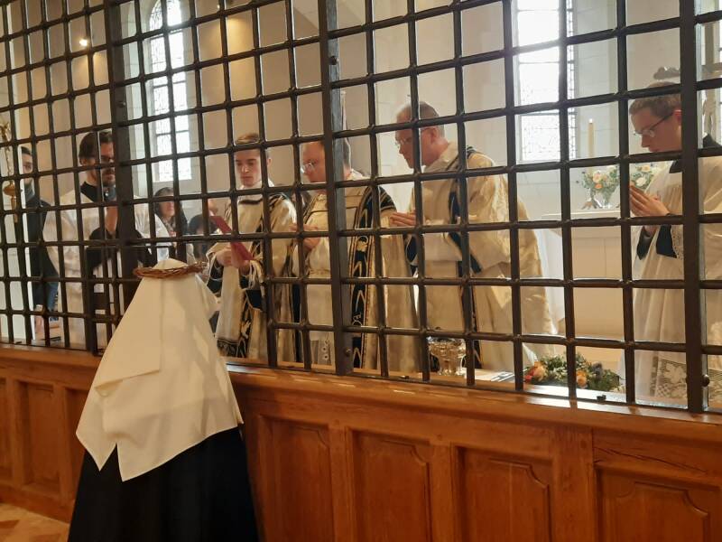 De priester wisselt de kazuifel voor de koorkap en gaat (met D, SD en C) naar de postulante die achter het slot/rooster languit op de grond ligt.