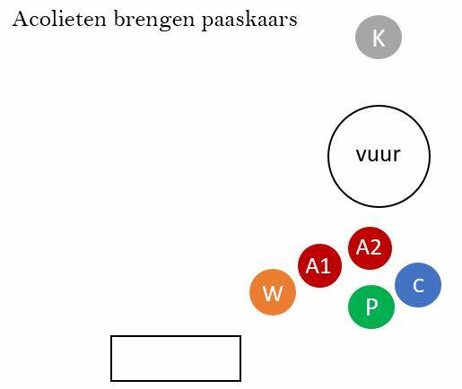 A1 geeft de paaskaars aan P.A1, A2 en C nemen een niet-ontstoken kaars mee. C neemt ook het dunne missaal mee (tenzij men meerdere missalen gebruikt en er een missaal klaar ligt op de pupiter aan de priesterstoel.)