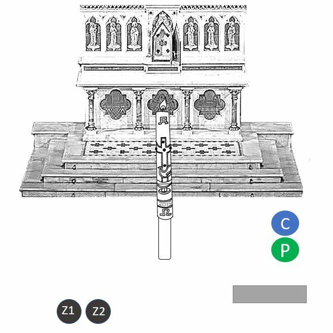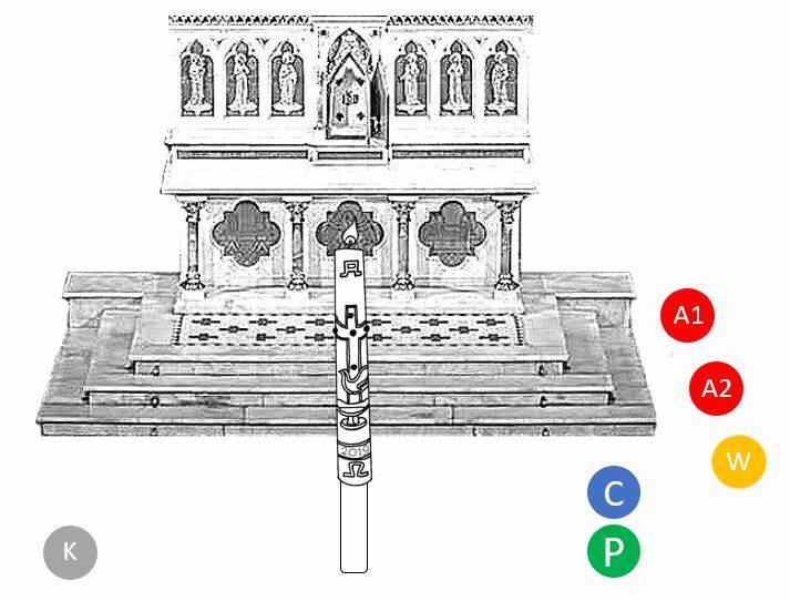 Aan het altaar gekomen maakt W een kniebuiging en gaat aan de credens staan. De kruisdrager gaat rechtstreeks naar de plaats zoals hieronder aangeduid op de afbeelding. De acolieten maken een kniebuiging en gaan ook naar de credenstafel.